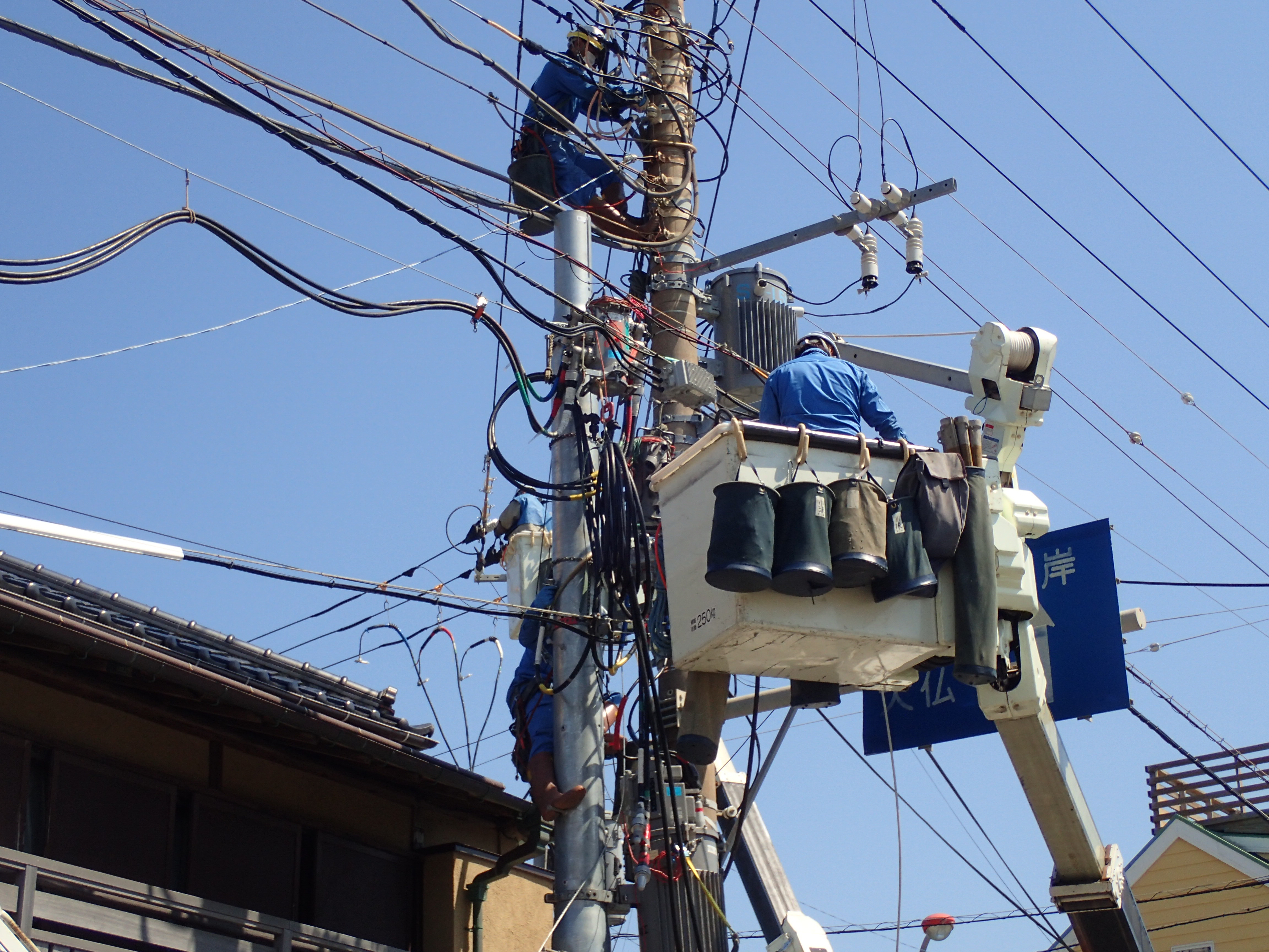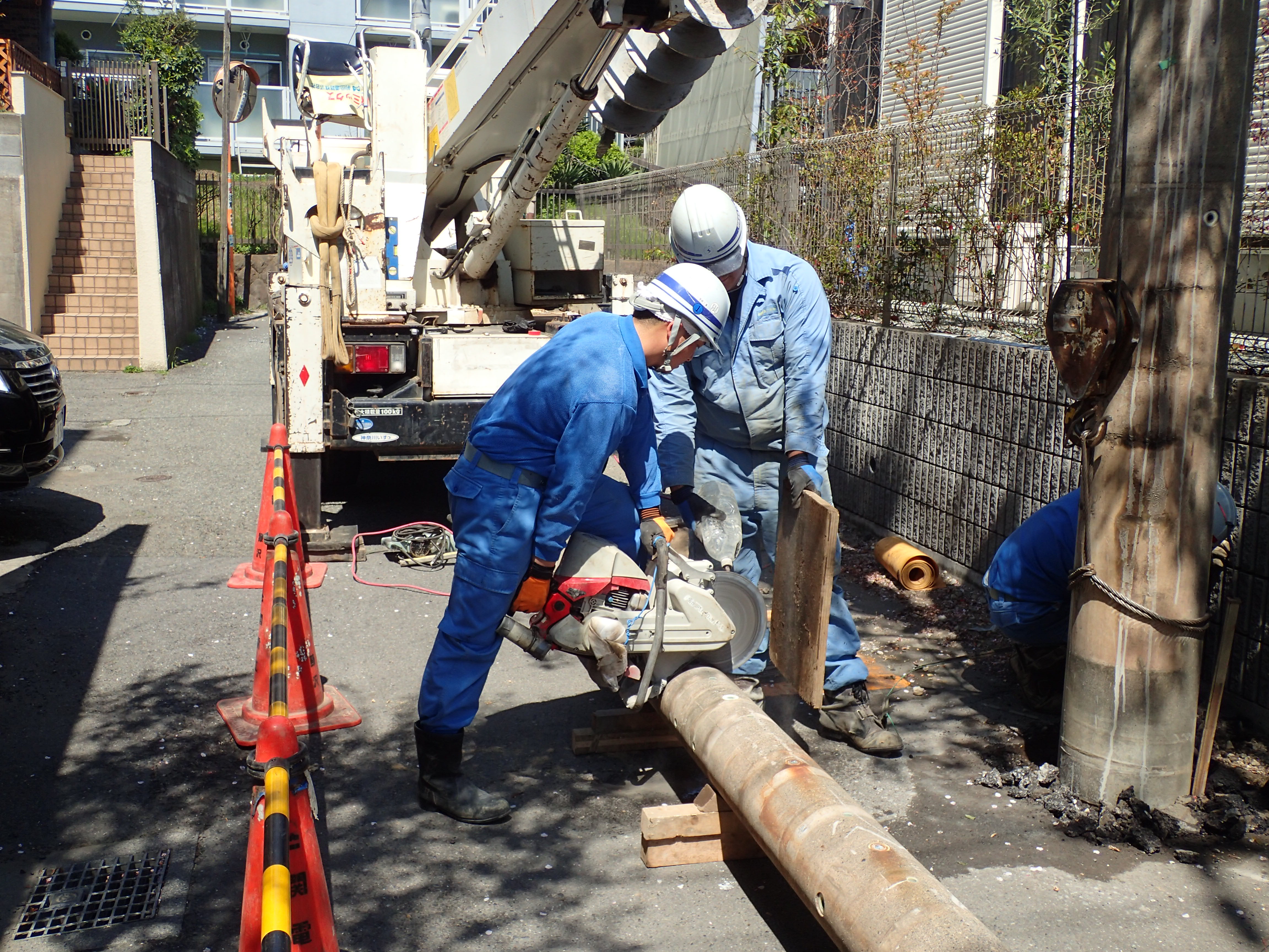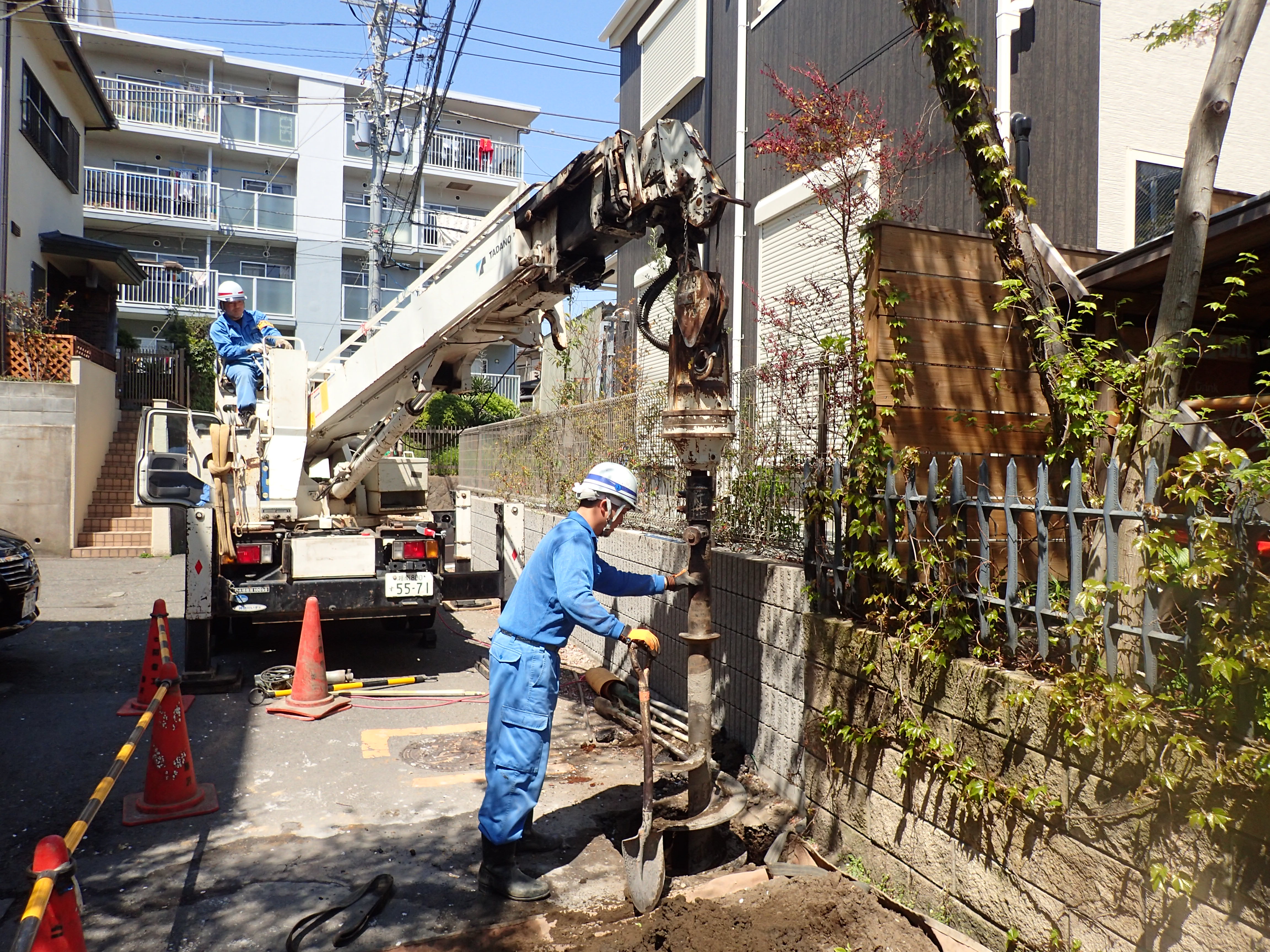 現場には、民家や敷地を区切る壁があり架空には通信線や電線が数多く障害物があります。
